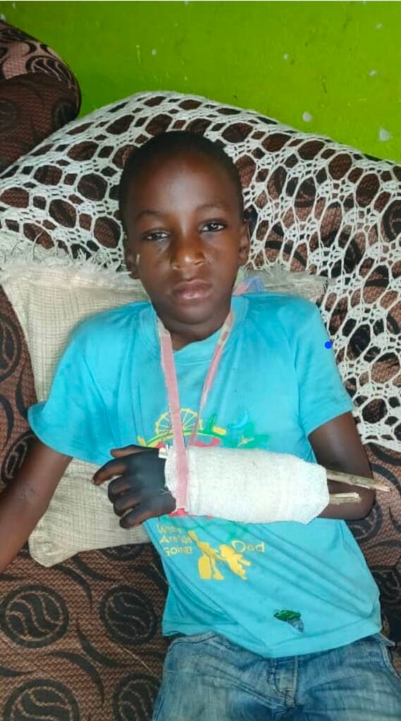 Enkele dagen geleden viel Emmanuel tijdens het rennen naar huis uit school in de regen. Hij viel en raakte zijn hand ernstig gebroken. Zijn grootmoeder dacht dat het een kleine verwonding was en verzorgde hem thuis, maar de pijn en zwelling werden alleen maar erger.